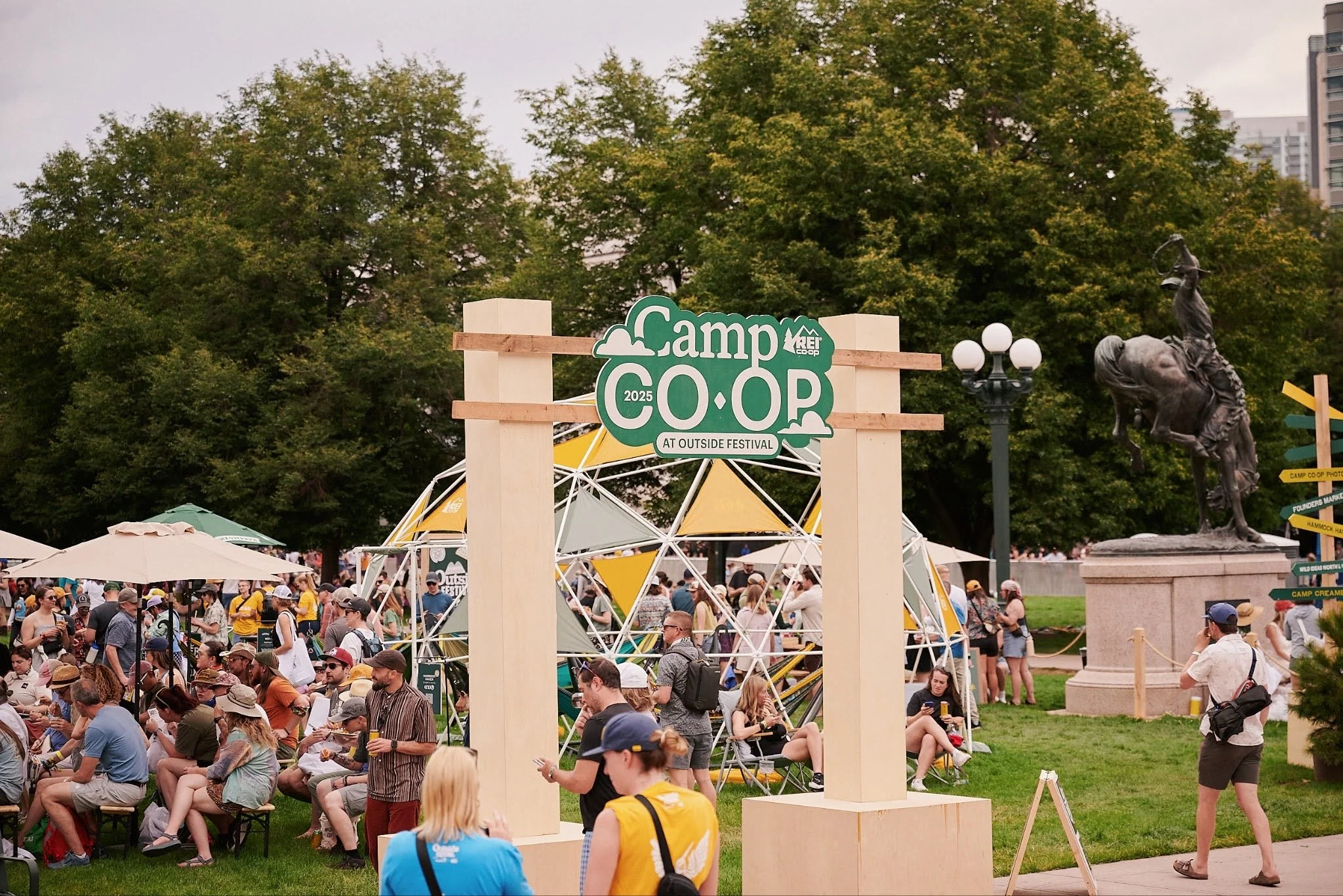 Guests were welcomed by a prominent, photo-worthy archway. Inside, they could engage in activities such as crafting friendship bracelets and coloring REI-branded postcards to send to state senators, advocating for the protection of public lands. A "hammock haven" offered a relaxing retreat for weary festival attendees. REI members enjoyed exclusive giveaways at the member outpost and were directed to a VIP experience at partner Capital One's space. Ben & Jerry's also collaborated with REI, offering themed ice cream throughout the festival.